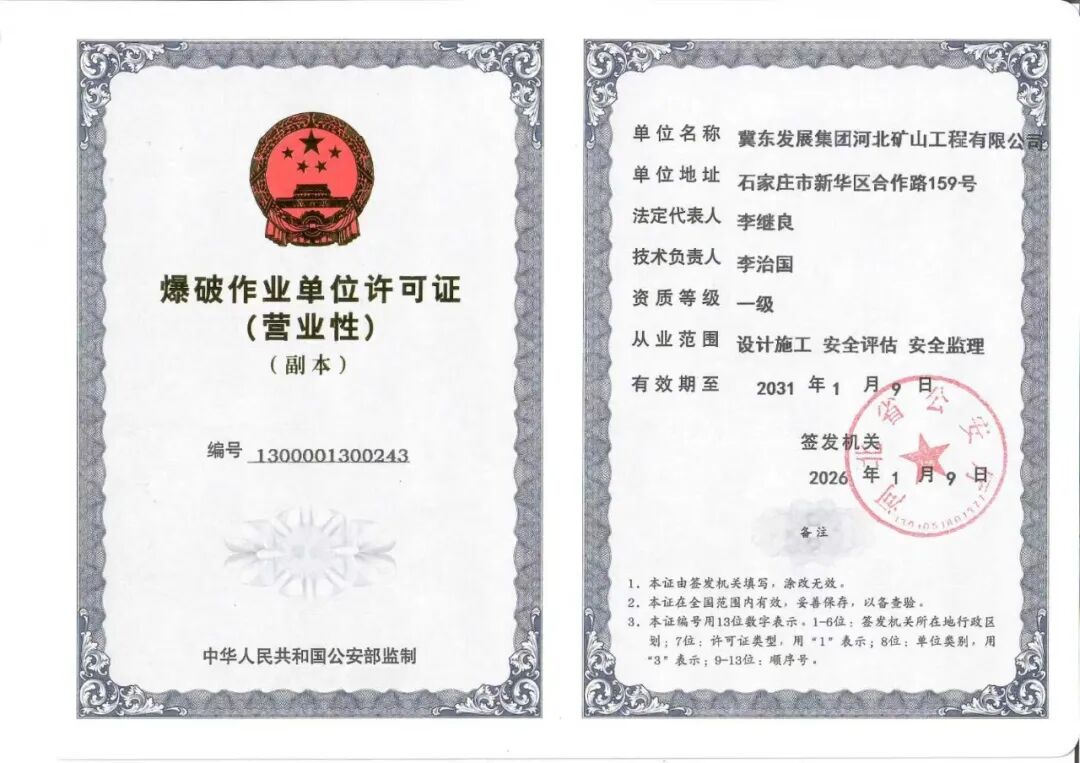2026年伊始,冀东发展集团河北矿山工程公司成功取得爆破作业一级资质,进入矿山工程施工总承包、爆破作业“双一级”资质序列,体现了企业已具备各类高难度、大规模爆破工程施工能力和全流程矿山工程总承包能力。